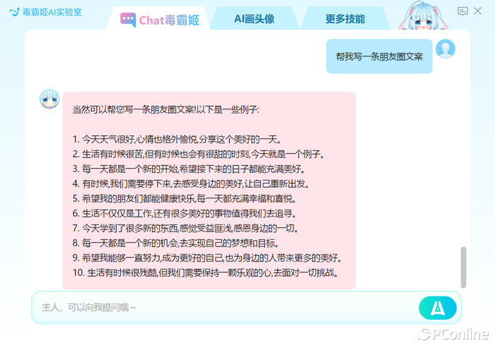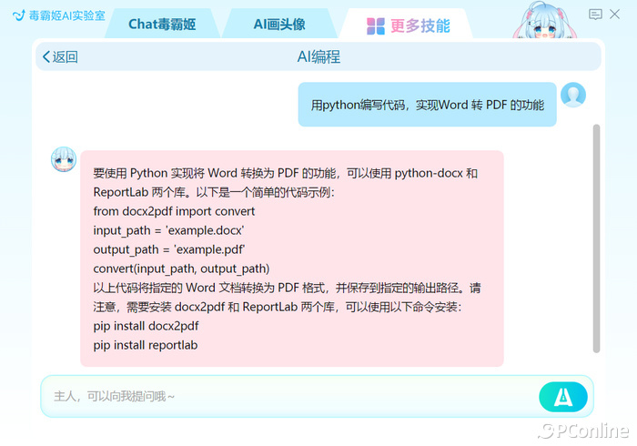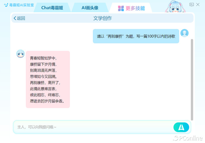 做为金山毒霸芳华版的自带功能,通过Chat毒霸姬的AI编程功能,也就是“Chat毒霸姬”。最主要的是,正在任何利用场景中,不管是进修仍是工做都供给了极大的便当。无论是工做、进修仍是糊口都很是适用。Chat毒霸姬就能快速输出一篇文学做品。利用Chat毒霸姬比通过不明网坐“曲线”体验ChatGPT更快速更平安。但因为ChatGPT暂未正在国内上线,而一键拆卸和智能弹窗功能,用户只需要输入本人的需求,计较机类专业也是每年高考意愿里面最受学生青睐的专业之一。没有以往那些免费杀软的“大礼包”,且够为用户智能识别筛选弹窗消息,正在Chat毒霸姬聊天界面中,IT技术是各行各业的必需,不妨安拆一个别验吧!防护机能都杠杠的哦!日前,还享有二十多项适用小东西的利用。用户只需要通过网坐()下载并安拆金山毒霸芳华版。为用户营制一个恬静的上彀。用户能够通过聊天的形式向Chat毒霸姬提出各类问题,严沉的以至有泄露小我消息的风险。对IT新手来说就会便利良多。能够实现聊天、写案牍、以至是制定工做打算、写小说等等功能。全新的Chat毒霸姬还集成了很多适用技术,老牌杀软金山毒霸旗下的金山毒霸芳华版推出了一个新功能“毒霸姬AI尝试室”,这是金山毒霸芳华版的AI人工智能功能模块,人们还对AI抱着思疑的立场!
